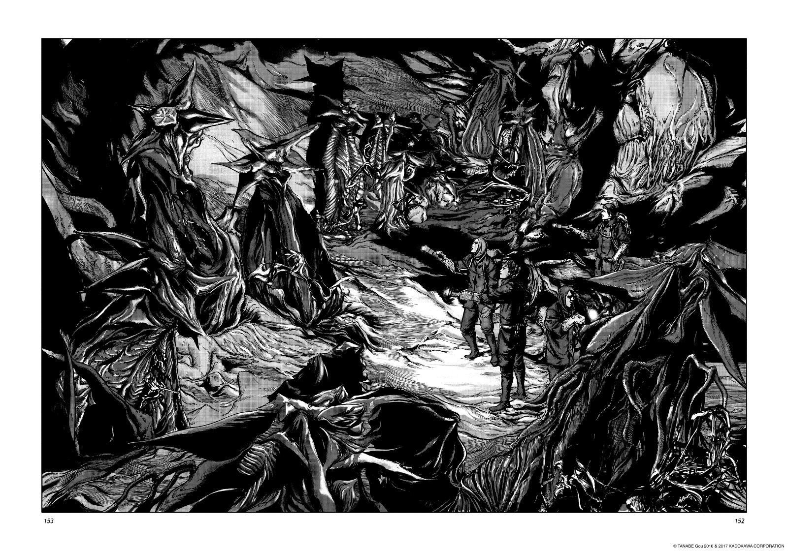 Pour ce qui est des planches, Gou Tanabe est un génie. Tout est extrêmement bien détaillé comme je le disais dans ma chronique précédente, le noir et blanc renforce ce sentiment de peur, de folie et dans ce tome, plus particulièrement un sentiment de claustrophobie.